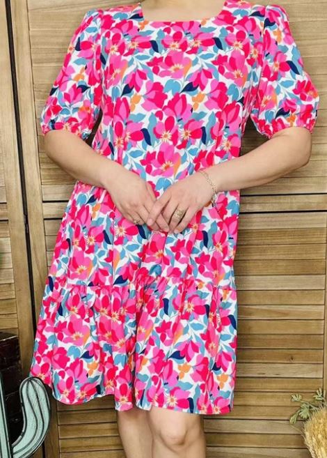 uchsia floral multi color printed short sleeve w/elastic band women dress w/side pockets Regular to plus size to meet women different requests Machine washable, soft and stretchy fabric comfortable for daily wear